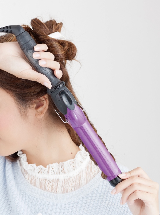 直拿電棒捲,抓起後方髮束向前捲,每束頭髮捲的方向都要一至,才能創造如同娃娃般的波浪捲,下層捲完後放下上層頭髮,以同樣手法捲過一遍。