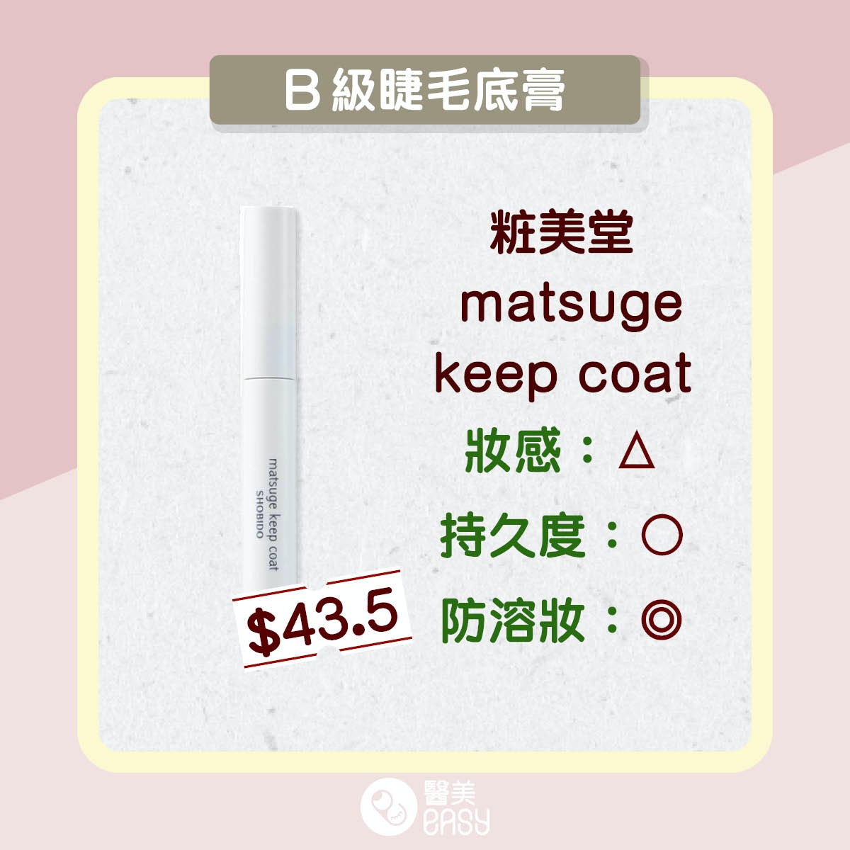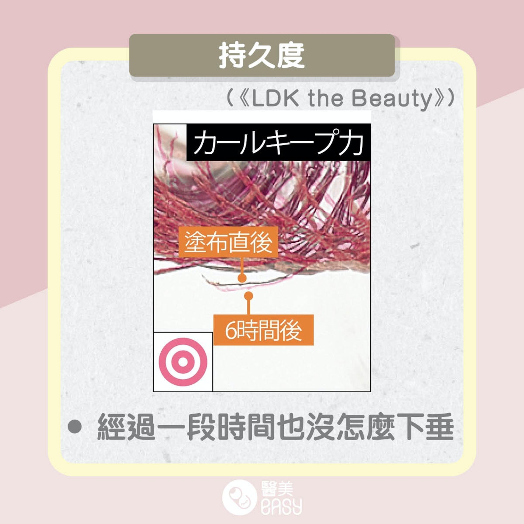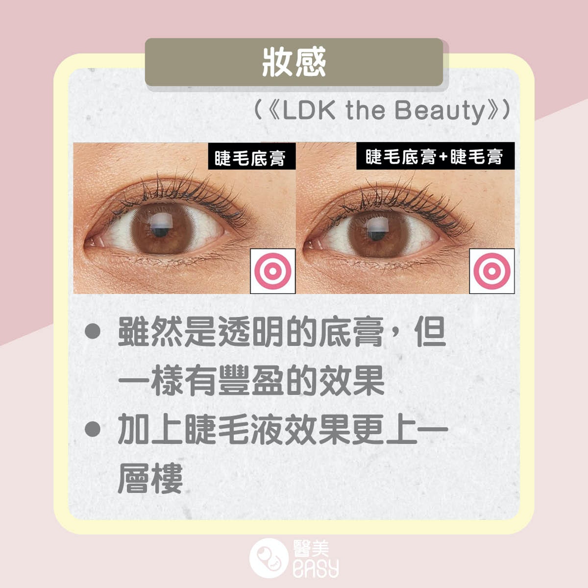 2. 持妝度:經常滴眼藥水、夏天經常出汗的情況建議選用防水的產品,但如果擔心損害到睫毛的話,可以選購能夠用熱水或洗面產品卸掉,含有保養成分的底膏。