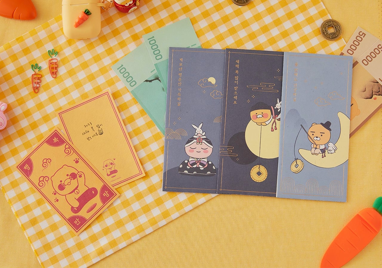 春節時同樣也有發壓歲錢習俗的韓國,並不拘限於使用紅包袋裝錢,深藍色的款式看起來更加典雅有設計感,上面還有和兔子在月亮上釣錢的春植、RYAN,以及穿著韓服的APEACH圖案,並內附春植幸運符咒小卡!兔年系列週邊12/21起已於韓國開賣囉~