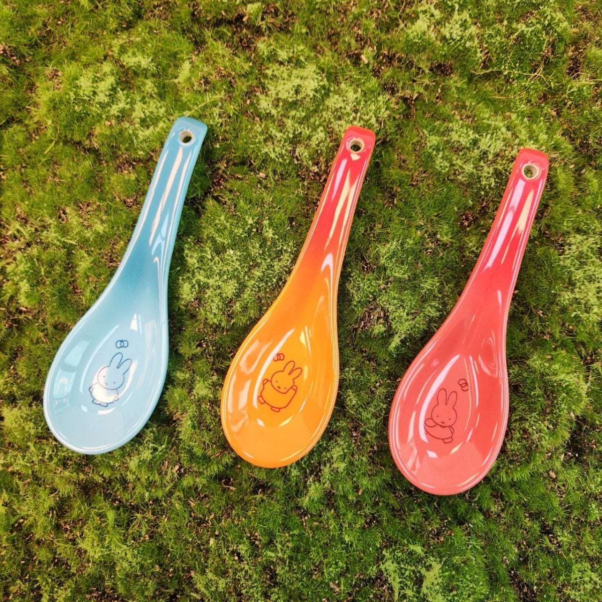 有了湯碗和盤子,當然也要搭配湯匙一起啦!瓷器材質堅厚耐用、表面細滑,不易沾染污漬或氣味,非常好清理,有紅、橘、藍三種顏色,每一款的米飛兔造型都不相同呢。