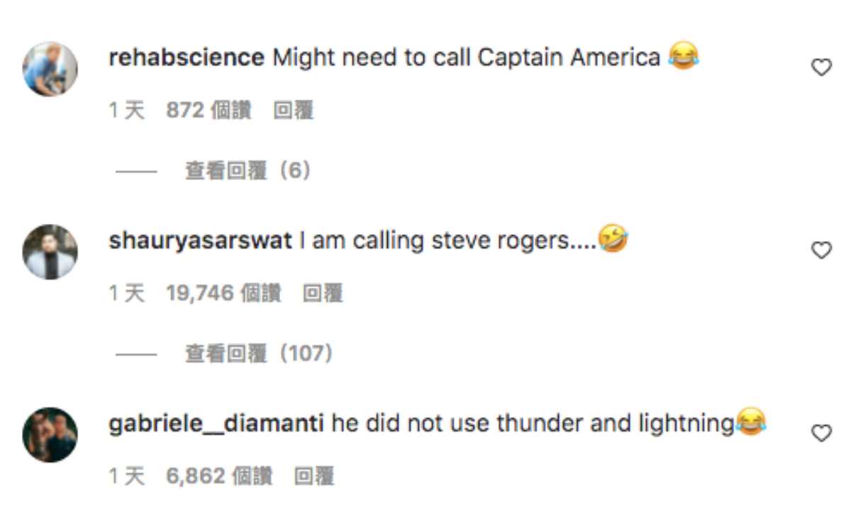 這段影片一上傳後,立即吸引超過全網300萬人的朝聖,不僅有人說「看來索爾有點生疏惹」、「索爾你還沒加上閃電一起劈」,而最多人在說的就是「快叫美國隊長來!」讓這位身材也是壯到不科學的漫威英雄讓你看看什麼叫劈柴~