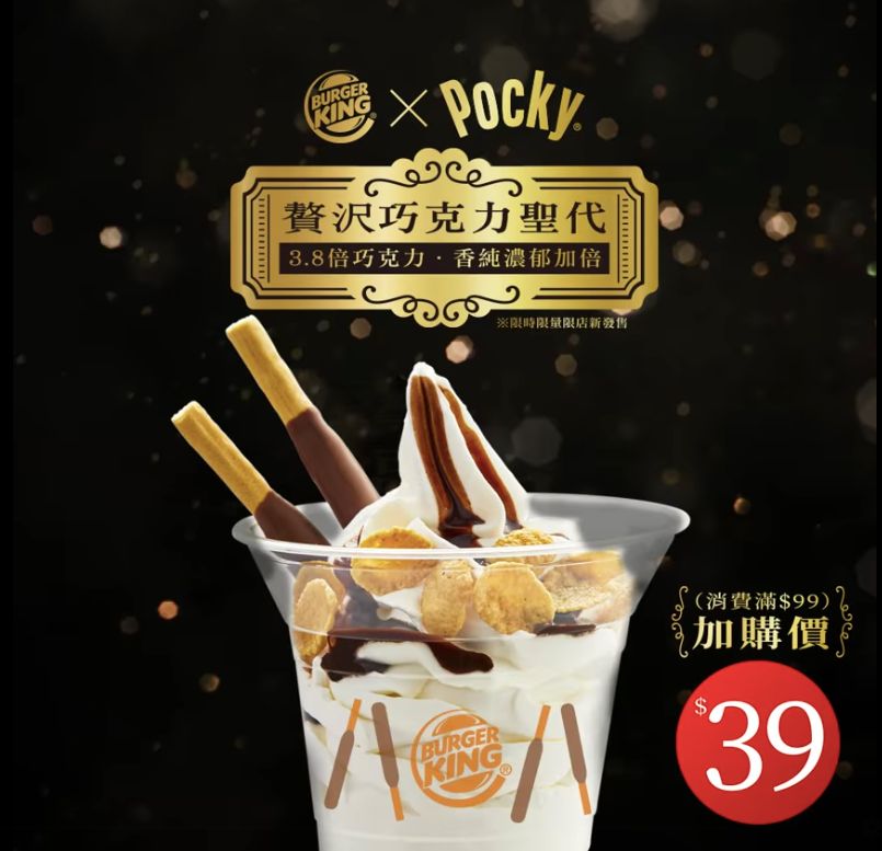 除了TABASCO以外,漢堡王進看更與巧克力棒「Pocky」聯名,推出「3.8倍贅沢巧克力聖代」!滑順涼爽的漢堡王聖代,加上3.8倍的Pocky贅沢巧克力棒,超幸福的享受,絕對是每個巧克力控都會愛上的滋味。