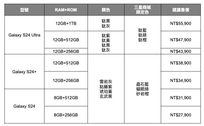 三星Galaxy S24旗艦系列一樣推出S24 Ultra、S24+、S24三種機款,分別為6.8吋、6.7吋及6.2吋螢幕,Ultra機款的顏色為鈦黑、鈦灰、鈦紫、鈦黃4色,而三星商城限定還有鈦藍、鈦綠、鈦橙3色,Ultra的紫色比較深近似深灰,男生也很適合使用。S24+和S24則有雲岩灰、鈷藤紫、琥珀黃、玄武黑4色,加上三星商城限定的晶石藍、貓眼綠、砂岩橙共7色,手機小姐覺得鈷藤紫較鈦紫來得亮眼!而S24 Ultra為Galaxy手機中首次採用鈦金屬材質邊框的一款,新一代康寧大猩猩玻璃也將抗刮擦能力提升四倍!喜歡鈦金屬質感的妞妞又多一款手機可以選擇啦~
