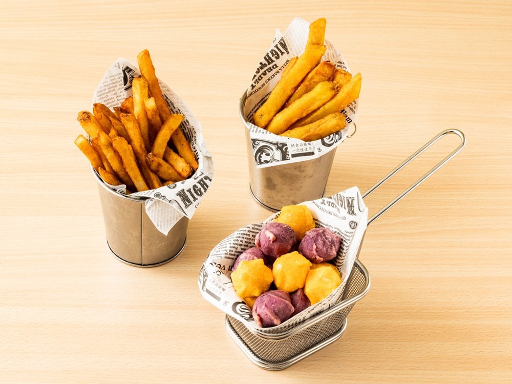 bb.q CHICKEN 88元炸物共5款,其中炸薯條(左1)、甜心QQ球(前)、