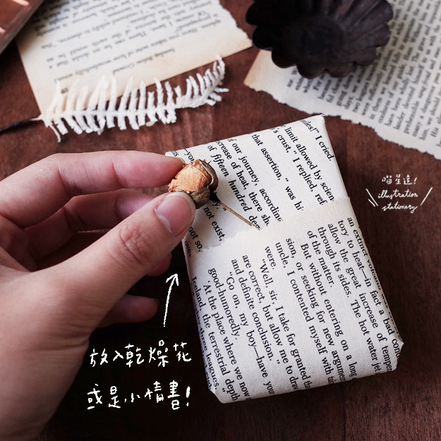 家裡常有一些用不到的原文書,內頁泛黃正好呈現復古的質感!可以將它隨意撕下來,不規則的撕邊,在包裝或拼貼上意外的好看呢!在包裝的時候,可以將兩張紙重疊,可以當作口袋,放入乾燥花或小情書很令人驚喜~也可以貼上裝飾小卡,寫上祝福的話喔!