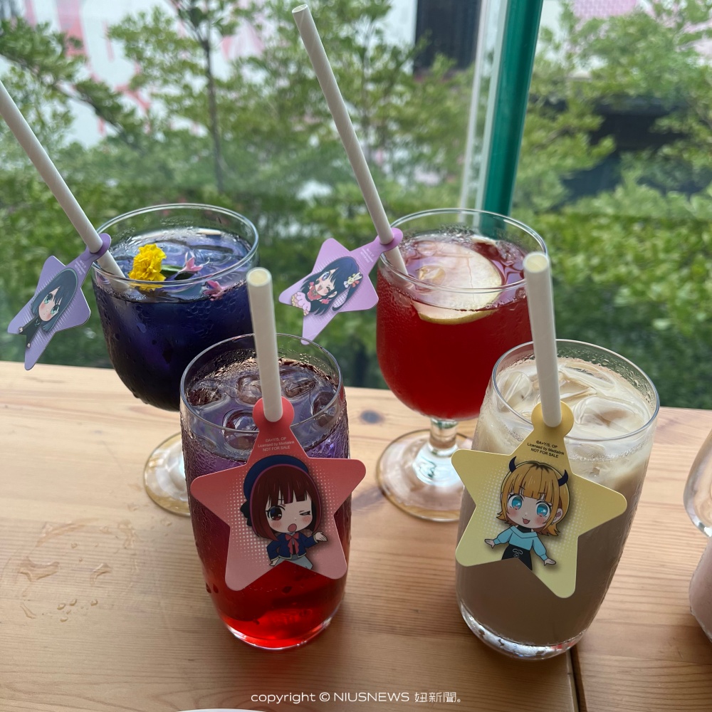 角色形象飲品的部分,不只推出「小愛的草莓葡萄柚水果茶」、「阿奎亞的藍柑橘可爾必思」、「露比的草莓優酪乳」、「MEMCHO的布丁拿鐵特調」、「佳奈的草莓蝶豆花氣泡飲」、「茜的藍莓蝶豆花氣泡飲」,還有粉絲們敲碗的三款「Q版印刷奶蓋紅茶」。凡消費任一飲品,就能獲得角色杯墊乙張(共7+2款隨機發送,恕不挑款),而台北西門店及台中一中店也將送出各一款的限定款杯墊!