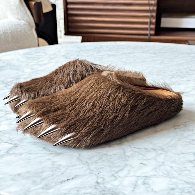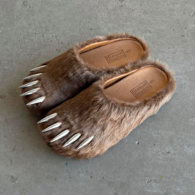 這雙「BEAR CLAW MULES」乍看就是一隻毛茸茸的棕熊腳掌,不只有棕色毛海,還有5根看起來十分尖銳、殺傷力滿值的銀色熊爪」,任誰套上都能馬上體驗當作山中之王棕熊的感覺,其實用料很不馬乎,是採用人造毛皮、定制模壓鋼和皮革內裏精心製作而成(不是真的熊毛,不要恐慌)而且還是現在正夯的「穆勒拖鞋」款式。