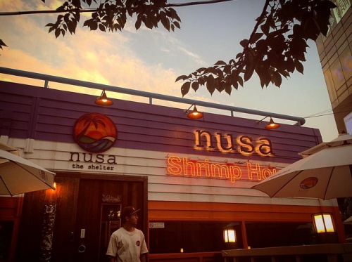 位於麻浦區的Nusa The Shelter Shrimp House,不僅靠近漢江,可以吹著江風、吃著那美味的蝦料理以外,連整間店的裝潢都採用海洋風式的設計,從logo所見的椰子樹和飄動的海浪,到木製的牆面與地板,甚至連外面都還設有大傘區,根本就是置身在夏威夷的感覺啊!(難怪Dok2喜歡來,這就是家鄉味)
