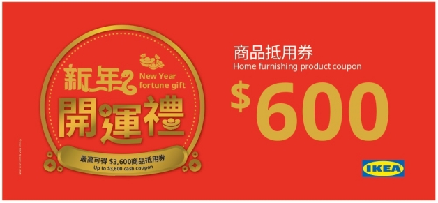 IKEA為卡友推出限時專屬的新年開運禮,即日起至1月22日,單筆消費家具家飾滿 6000元,即贈600元商品抵用券、最高可獲得3600元抵用券!