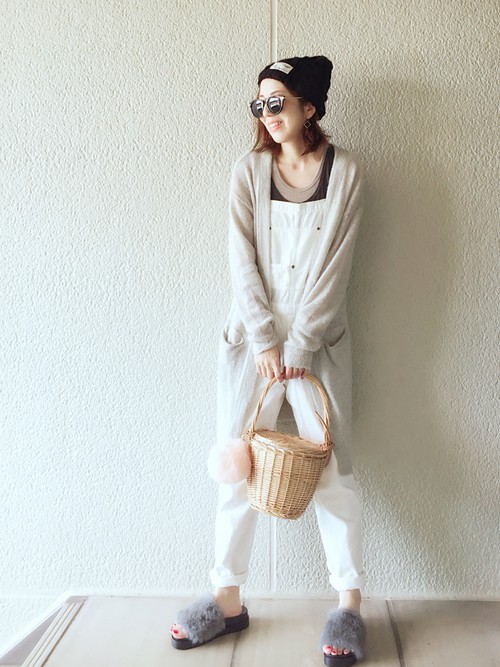 灰色的毛毛拖鞋真的非常百搭!休閒感的白色吊帶褲搭起來也不會違和呢!