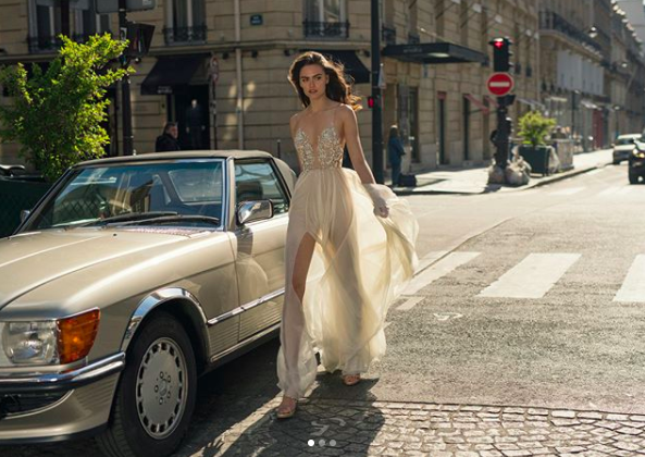 此次王棠云身著的是2018年巴黎系列款式,有別於刻板印象中裙擺誇張、層次厚重的婚紗模樣,Liz Martinez此系列著重在女性身形曲線的描繪,貼身優雅的蕾絲、搭配上簡約線條的剪裁,沒有多餘綴飾的整體設計讓婚紗突破既往,並將女性的柔美特質展露無遺。