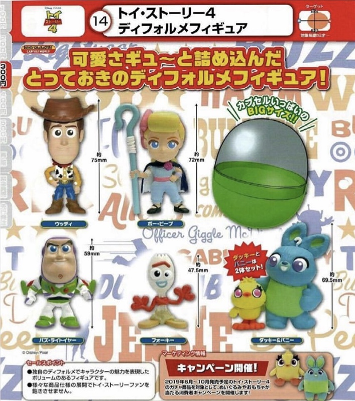 今年對玩具總動員的粉絲來說,真是很幸福的一年,幾乎每個月都有系列扭蛋,這個月有主角胡迪、巴斯和牧羊女,以及新角色叉奇、鴨霸和兔崽子的公仔耶!這款扭蛋份量不小呢,最高為胡迪有7.5公分高,最小隻的叉奇也有4.7公分。
