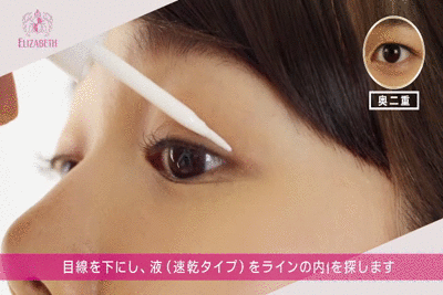 確定好下手位置後,將雙眼皮膠均勻塗抹在剛剛確定好的雙眼皮線位置。 等待液體乾掉後再塗抹第二次!(超快乾的效果對忙碌的早上很合適。)