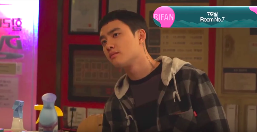 D.O.在《七號室》中飾演「憤青」大學生泰正,因為就學貸款和家庭的因素,目前在鴨鷗亭的DVD店打工,而申河均則飾演DVD店老闆斗植,他們在「7號室」內發現神秘屍體後,關係到生存和秘密的窘境,就此展開各懷鬼胎的戰鬥!