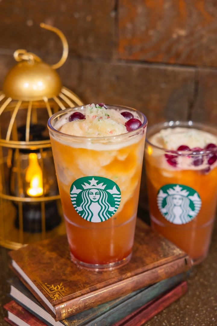 星巴克首次推出的「蜂蜜公爵爆爆星冰茶」是以劇情中的蜜糖公爵糖果店為靈感打造,每口都藏著「蜂蜜爆珠」的甜蜜驚喜!飲料使用清爽的蜜柚星冰茶為基底,搭配蜂蜜爆珠,頂部再用繽紛糖果碎來點綴,呈現魔法世界的奇幻氛圍。
