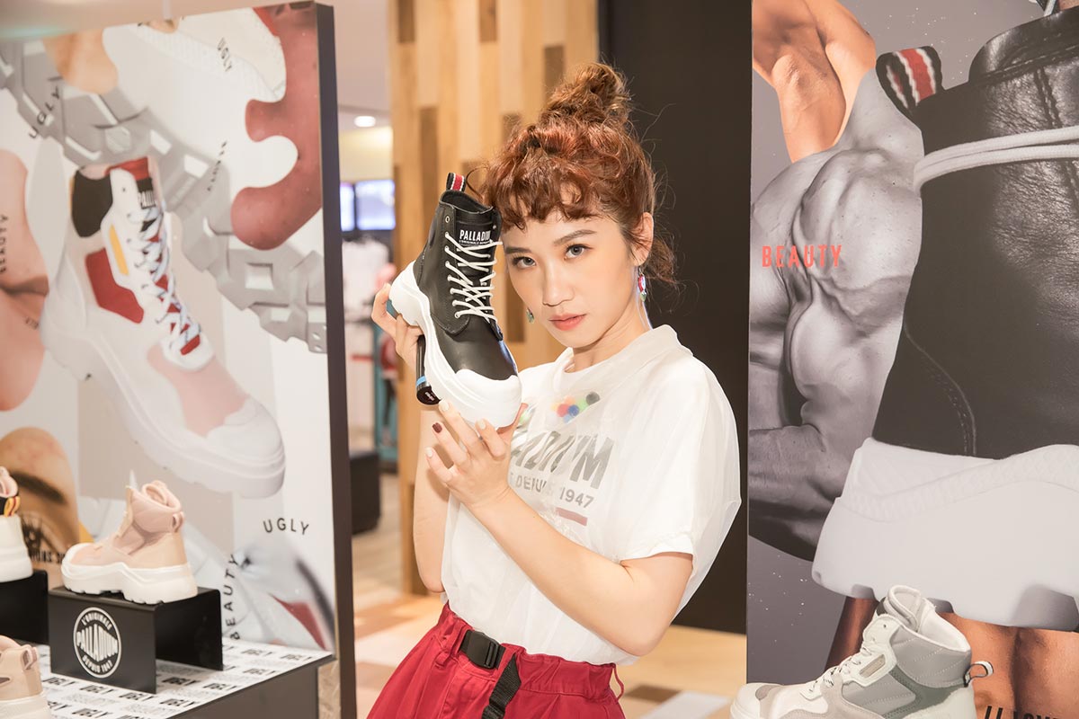 最近以百變造型完勝金曲獎並甫發行個人單曲《巴豆痛》的Lulu黃路梓茵受邀出席逛展,並現場演繹最新PALLAKIX 90 TX法國配色,以PALLADIUM Logo白T搭配紅色高腰裙修長視覺比例,展現大方自信的態度;同時也分享每個人的審美觀都不一樣,但是要把別人認為的不好看,自己也可以把它變得好看,除了心態調適,怎麼找到適合自己的穿搭方法,不一定要去追求流行,自己私服穿搭會選擇寬褲或中長裙,再搭配一雙厚底或隱形增高的鞋款修飾比例,「把別人覺得的UGLY,變成你的Own Beauty!」
