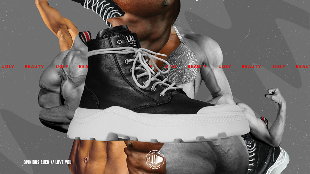 延續2019年PALLADIUM 年度計畫 「#UNIFORMOFTHEPEOPLE-為世界帶來正向改變」,以UGLY BEAUTY為靈感發表品牌全新潮鞋代表作-「Δ世代軍種潮鞋PALLAKIX」,翻玩經典PAMPA x PALLAPHOENIX熔合雙大底,以大膽配色、異材質拼接,重新定義潮流軍靴霸主新風範,現場結合Nas Abraham創作的UGLY BEAUTY形象視覺,展示高筒款PALLAKIX 90 TX、低筒款PALLAKIX 90 LOW,以及真皮款PALLAKIX MID SK三大系列,以刺青、穿環、禿頭、時尚瘦、性別認同、有色人種等視覺意識搭配鞋款色調呈現,傳達不被刻板印象束縛、勇於表達自己的態度,展現Δ世代的不斷變動、#我不被定義 的態度。