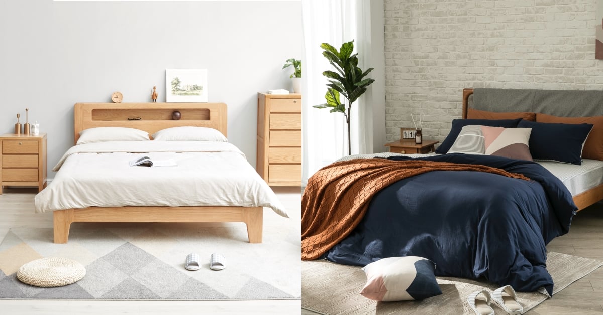 源氏木語西雅圖橡木多功能夜燈雙人床架(左圖),售價17,200元,特價14,999元,100%純實木,床頭夜燈設計,兩側可收納儲物。hoi!撞色針織被套床包枕套雙人四件組(右圖),售價3,980元,特價3,224元,100%針織純棉布料,精選AB版花設計,通過ISO國際品質管理認證,台灣在地製作品質有保障。