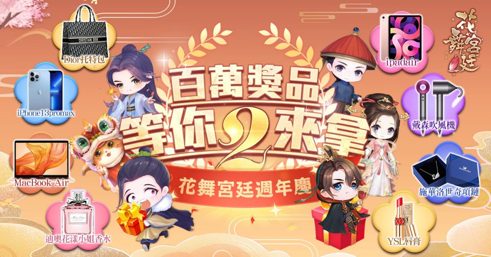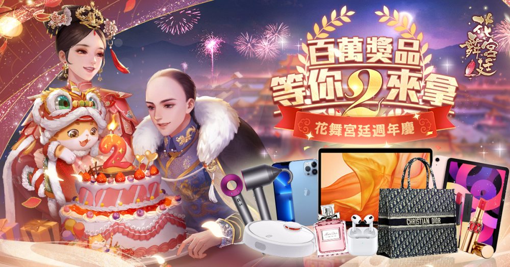 說了這麼多,讓人心動的「許願池」究竟在何處?(在哪裡~在哪裡~)這些百萬實體獎品其實是遊戲《花舞宮廷》為了兩週年盛典,特別準備給各位小主的禮物,除了iPhone 13 PRO MAX或Dior包包,還有限定的訂製週邊獎品,只要下載遊戲並完成任務,就有機會把它們帶回家,搶先送給自己「年終好禮」!(笑)