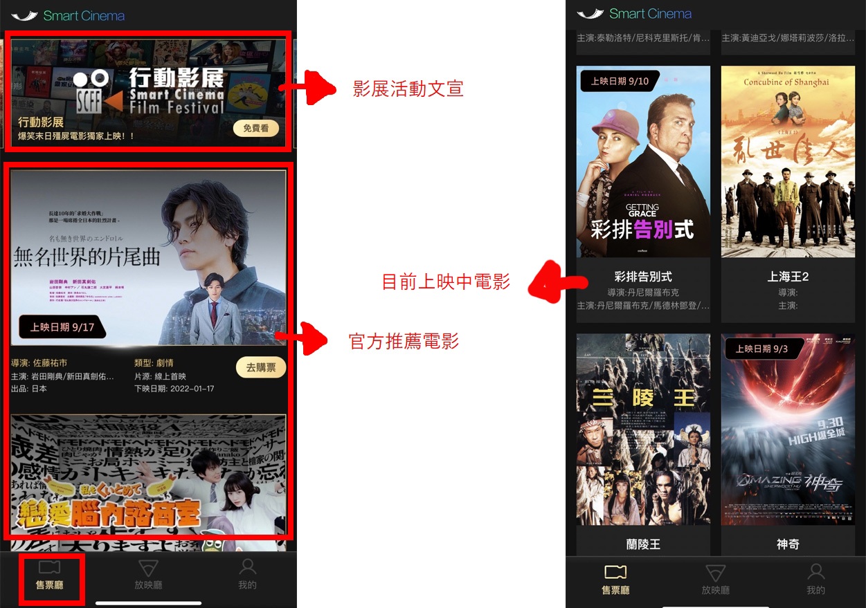 APP操作簡單才能符合大眾需求,行動電影院的APP操作方式也非常簡單,就連不會用手機的3C邊緣人,都能夠快速上手,APP沒有複雜的選項,只有「售票廳」、「放映廳」以及「我的」(設定)三種選項。