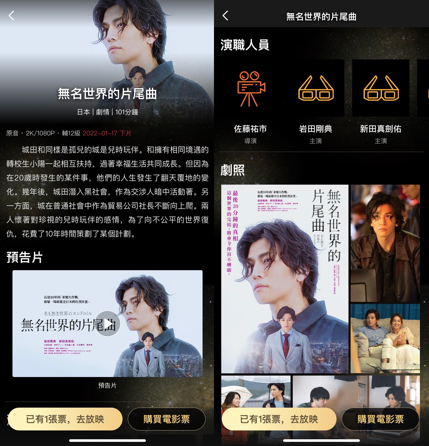 在售票廳中看到有興趣的電影,可以直接點擊「去購票」,也可以點擊影片圖示,就會進入到影片介紹的畫面,看到更多關於這部影片的簡介,包含片長、劇情大綱、預告片、演職員表、劇照等電影相關資訊。