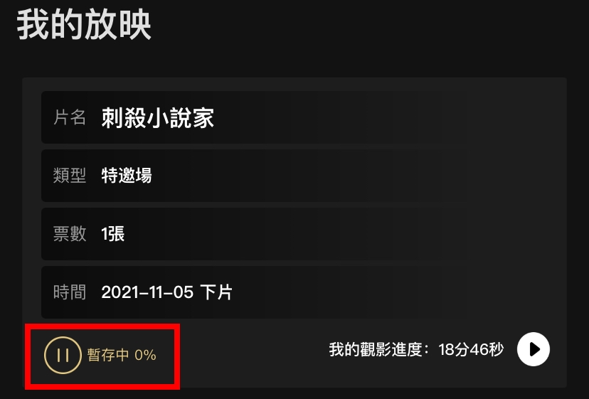 而觀影中則僅有暫停鍵跟播放鍵兩種模式可以選擇,跳出APP影片進度會自動保留,爾後有空要繼續看的時候,再進入放映廳按下播放鍵,影片就會從上次觀看進度中繼續放映。