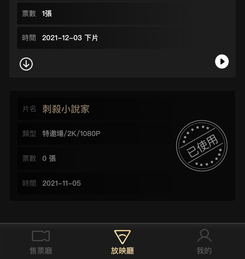 放映廳裡擺放的則是已購買但尚可播放但未放映完成的電影,也就是說已經購買兌換,但還沒下映,也還沒播放結束的電影都會在這裡。