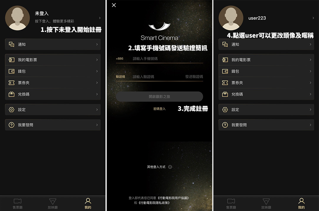 「我的」就是我的帳號的意思,舉凡帳號設定以及消費紀錄、點數購買等都可以在這裡面找到,而最初始的註冊帳號,也是在我的裡面可以註冊帳號。行動電影院的註冊帳號方式多元,除了可以使用手機號碼註冊之外,也可以使用E-Mail、LINE等方式註冊。
