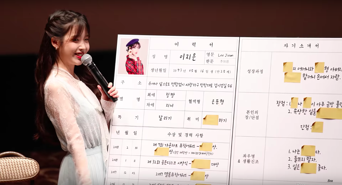 在現場IU開始進行介紹「個人履歷書」的環節,撕掉「特技」那格答案時,居然出現特技是跑步(달리기 ),大家還記得IU在《孝利家民宿》擔任打工仔的時候的「小跑步」模樣嗎?跑步時也常常身體比腳步前面,結果IU說:「這次在韓劇《我的大叔》中飾演的角色李至安拍攝時真的很跑了很多步,發現我真的跑步變快了很多」,一講完粉絲馬上質疑聲四起,IU馬上不服輸說「那我現在立刻跑給你們看!」