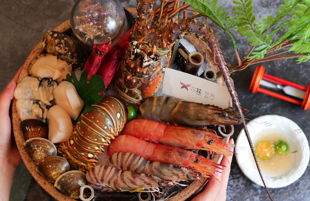 提到頂級海鮮,缺了重量級的深海龍蝦絕對是不完整的。最具話題的「60公分深海戰龍蝦」,肉質滑順細緻,附有高蛋白、低脂肪特性,烹煮後色澤亮麗,令人垂涎欲滴;以細膩口感聞名全世界的「南非活鮑魚」;高級懷石日料店才會使用的生食級蝦種,如龜山島胭脂蝦及葡萄蝦、鐵甲蝦,水族箱裡還有澳洲天鵝龍蝦、波士頓龍蝦、牛奶貝、馬來大蛤仔...等多種活體選擇。當然,不忘肉食朋友們,花花世界鍋物也提供來自日、美、澳的世界三大頂級和牛,多樣化的選擇不論是單人到訪,或是多人聚會都可以在這裡擇其所愛。