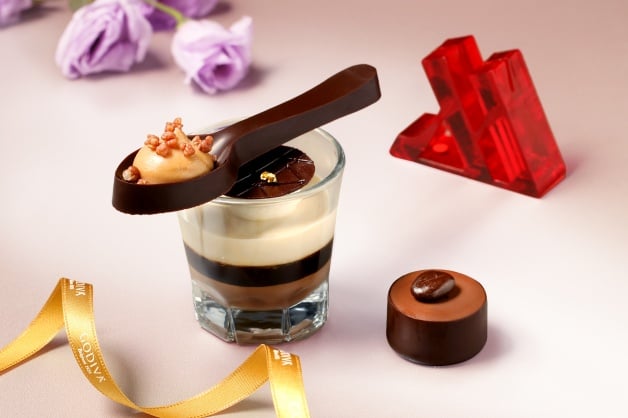 「咖啡摩卡杯」以夏之戀限定「香濃咖啡黑巧克力」為靈感,從咖啡杯延伸成咖啡摩卡杯,依序為黑巧克力奶油、義式濃縮咖啡凍和香濃咖啡慕斯,就連湯匙都是GODIVA72%黑巧克力特製精巧的小湯匙,上方還有些許跳跳糖,真的是名符其實地好吃到把湯匙吃掉!(笑)