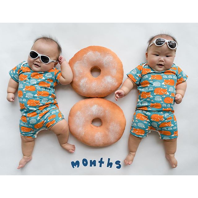 用甜甜圈排成「8」來慶祝兩人八個月大的時候~不得不說,媽媽真的很用心經營拍攝氛圍呢!等她們長大後再回頭來看童年照,一定揪甘心~