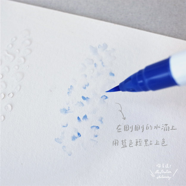 先用水彩筆沾水,在紙上輕點出小水珠,整個範圍呈細長的橢圓形。