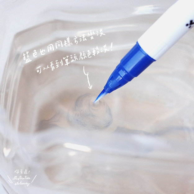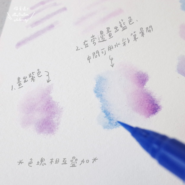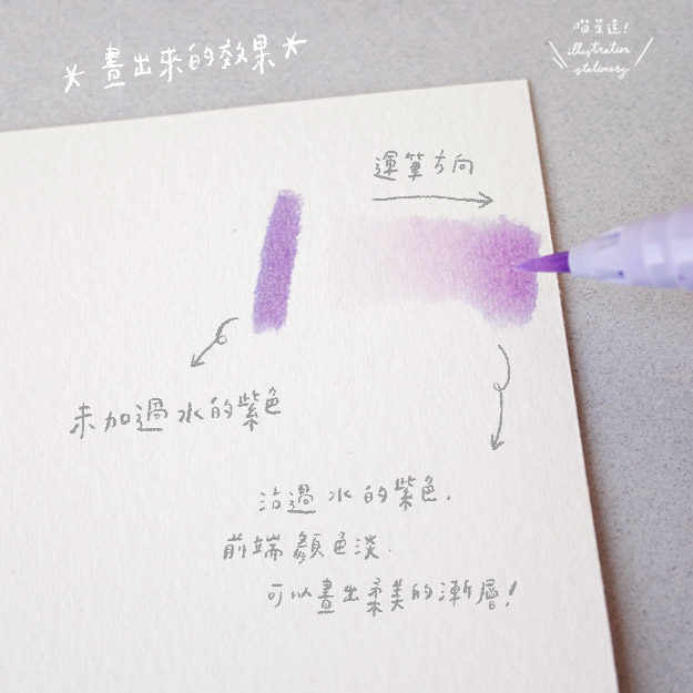 將色筆色彩調淡的方式,可以將筆頭輕觸水面,前端的色彩會變淡,越往後畫顏色越深。可以看下圖紫色的色筆,沾過水後可以畫出柔美的漸層。