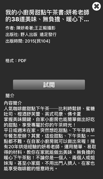 點進書本之後,就可以看到作者、出版社,以及最重要的書籍大綱等等介紹,也可以先試閱一小部分,再決定要不要借閱。
