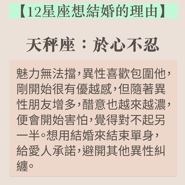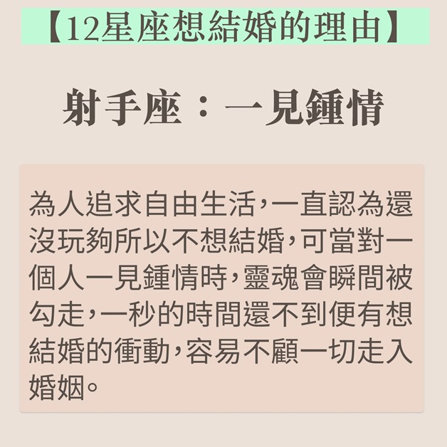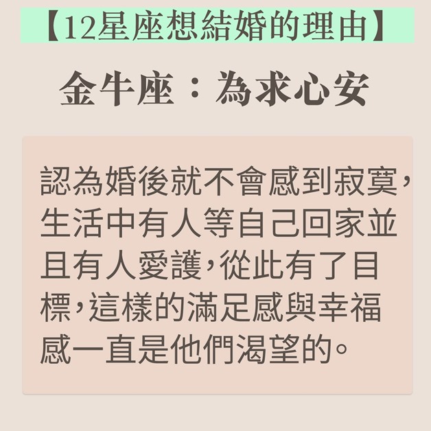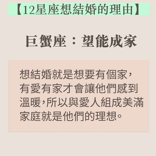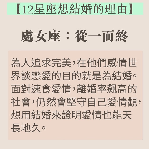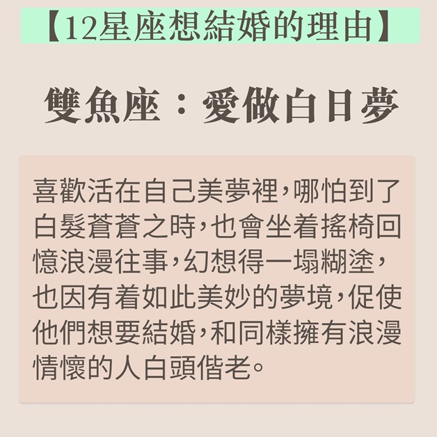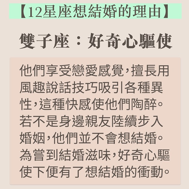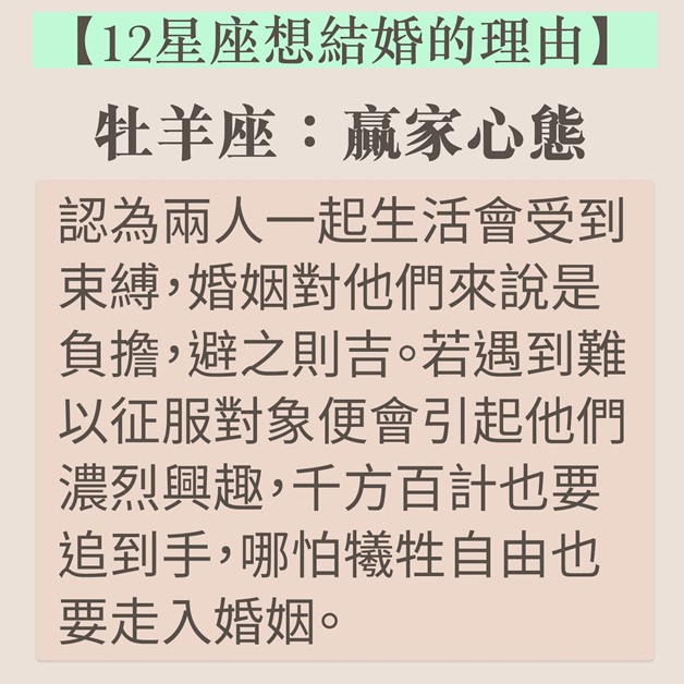 結婚是戀愛的墳墓?談論結婚時如果出現分歧,不「婚」即「分」?近日台灣就有星座運勢專欄分享了12個星座想要結婚的理由,巨蟹天生愛家,想建美滿家庭,雙子牡羊卻非真心。如果想想知道伴侶有否結婚意願,不妨參考以下資料。