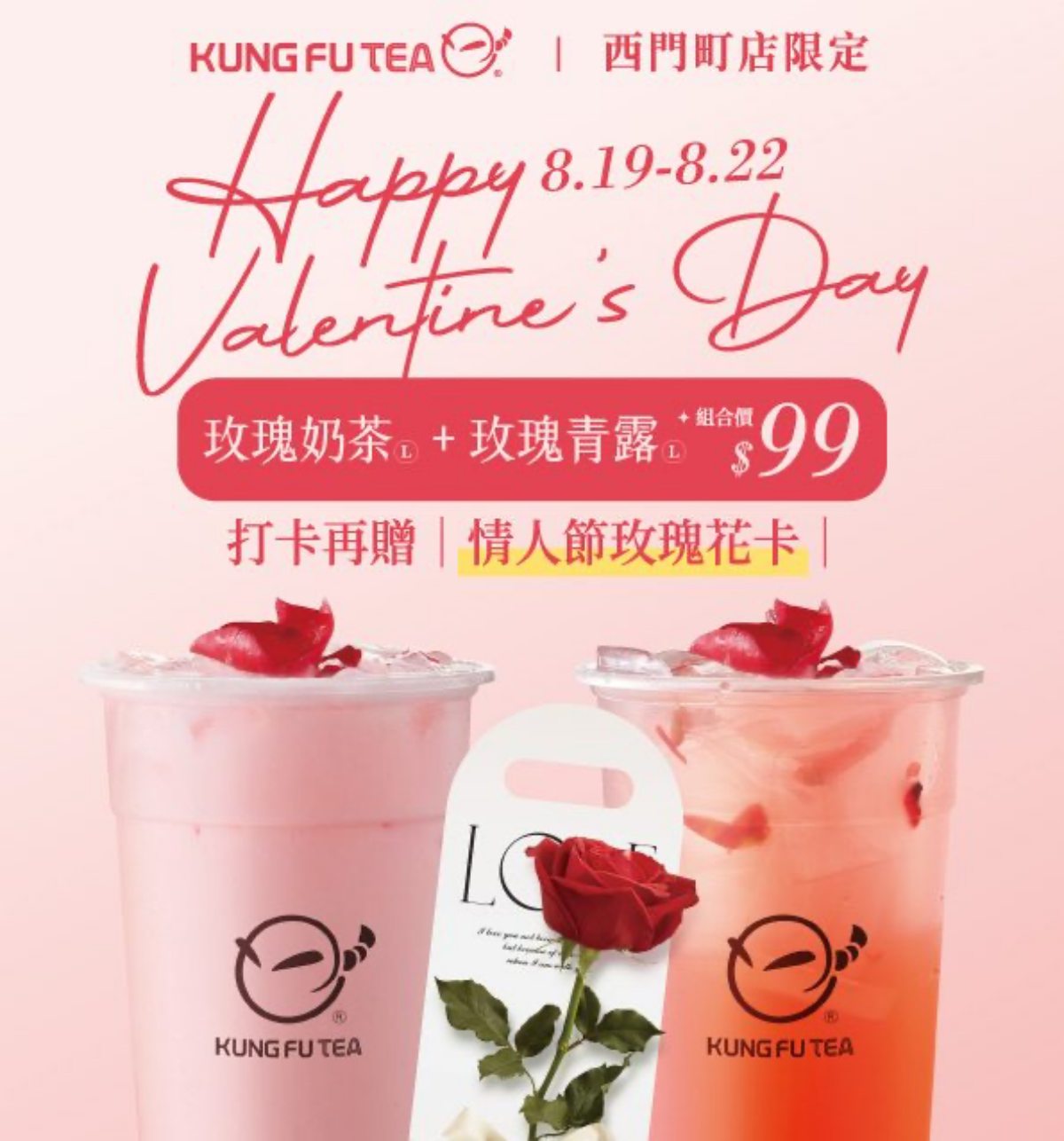 功夫茶與台灣插畫家嗨小強 HI JOHN聯名,8月16日起消費滿149元,就可以獲得「Q萌大頭杯墊」,另外購買飲料還能免費加料「烏龍茶凍」!因應情人節,8月19日至8月22日到功夫茶西門町店,購買玫瑰奶茶+玫瑰青露一組只要99元,完成打卡步驟,還能獲得情人節限量贈送的「玫瑰花與浪漫花卡」,無論是情侶送禮或同事朋友揪團都超應景。
