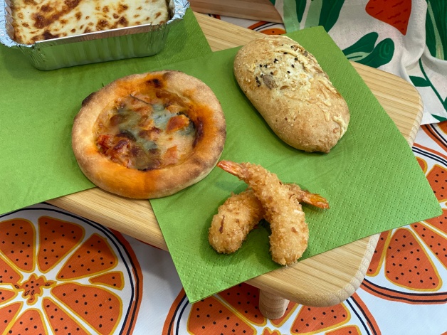 鹹食的部分有加入帕瑪森乾酪絲的「乳酪松露蕈菇派」、嚴選ASC水產養殖認證白蝦的「金黃椰香蝦」、小巧四寸的「瑪格莉特披薩」,如果家裡有小朋友的話,可以點「字母薯餅」,通通百元有找!