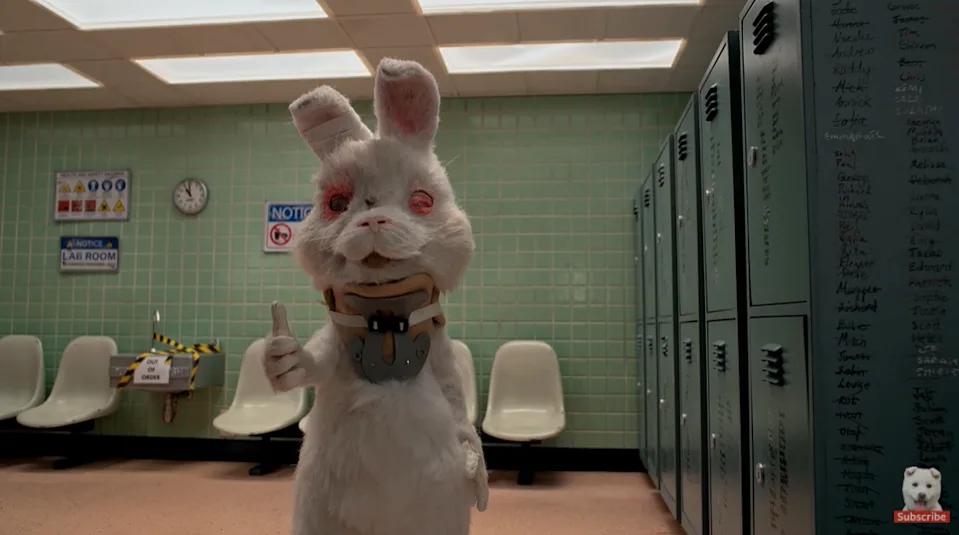 Ralph身上滿是灼傷地說著:「動物們被用來測試化妝品或清潔用品,像是眼線筆、沐浴乳、防曬乳或是你廁所裡的每一樣產品,如果沒有這個工作我可能就會像一隻普通的兔子了。」最後牠還豎起大拇指,好像在告訴我們牠還撐得下去,但旁邊的置物櫃上充滿著被劃掉的員工姓名(死掉的動物們),看了好心酸。