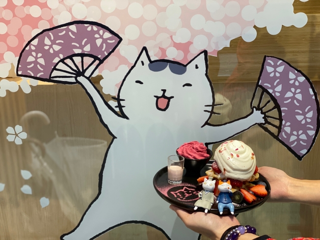 金雞母Café主色調為溫潤的暮色橘和沈靜的大海藍,並搭配正紅色的門簾,佐以綠色植栽和白色磁磚,與貓小姐Ms.Cat的聯名期間,店裝將為打造成粉色櫻花林,奴才們可以看到主子們穿梭在櫻花樹,像是胖白貓拿著扇子在跳舞、穿著和服的貓少女在門口迎接大家呢!(喵)