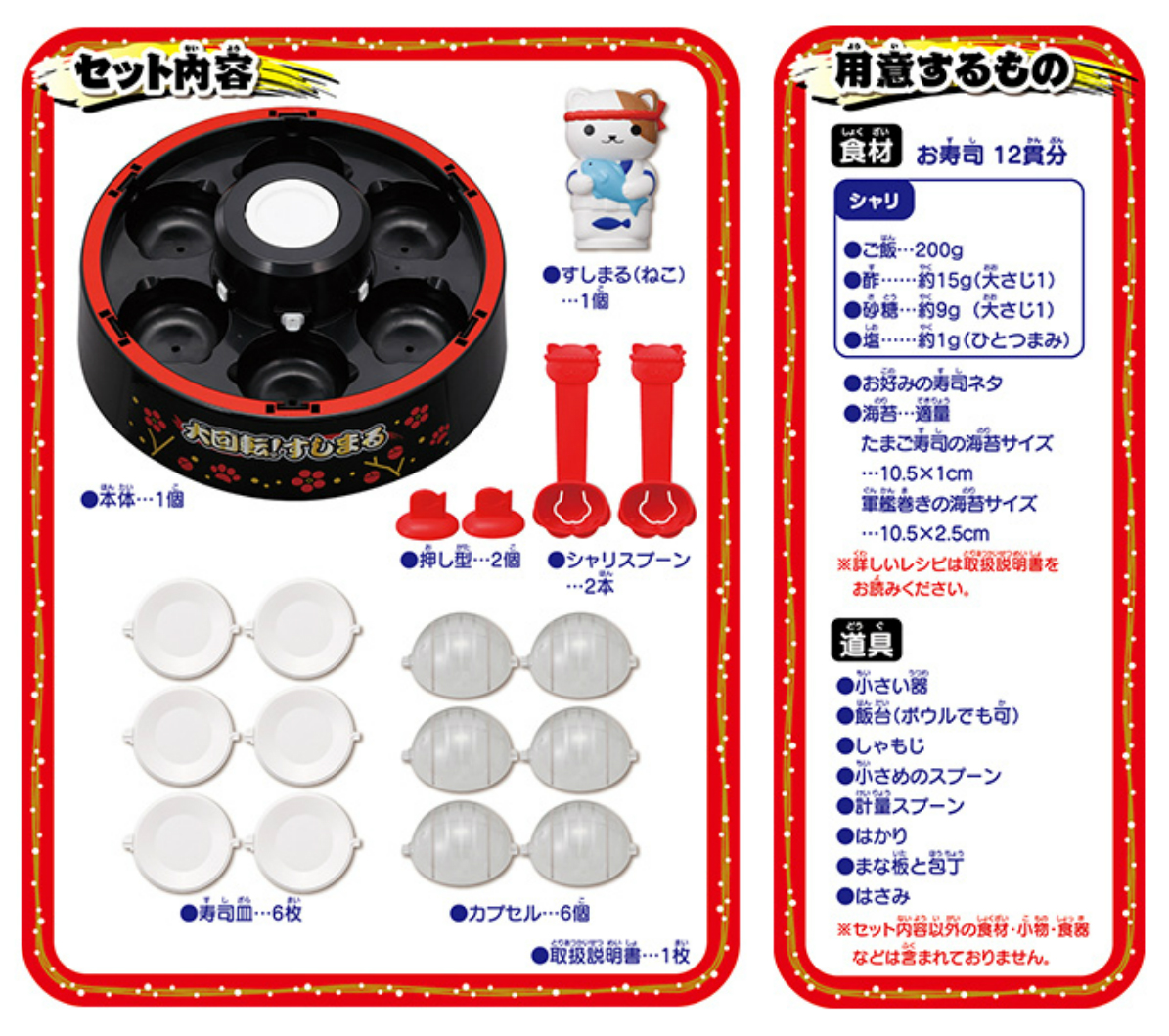 除了有基本的迴轉售司機器、壽司丸(就是那隻貓咪)、湯匙2支、壓蓋2個、壽司盤6盤、蓋子6個,還有簡易的料理DIY,讓大家在使用時可以不至於超量喔!