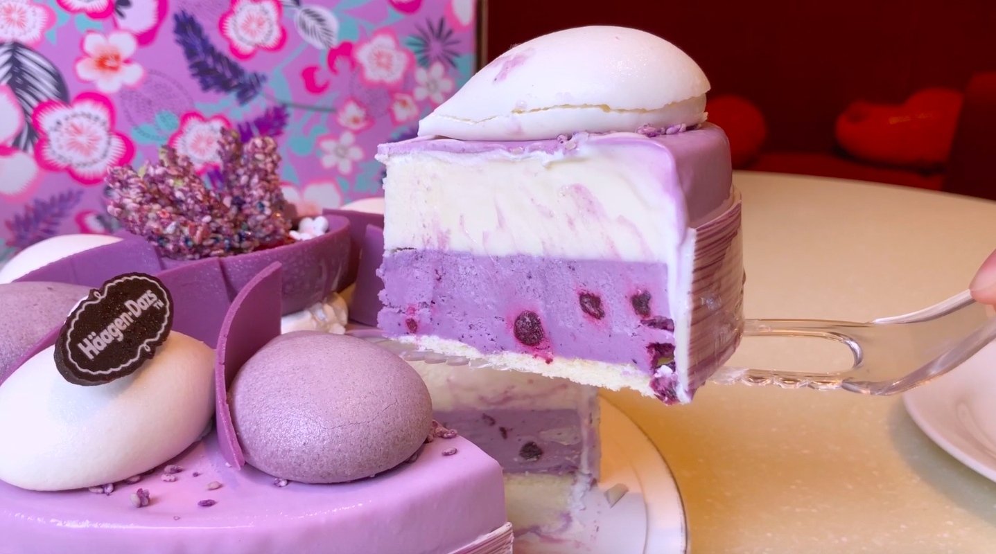 浪漫且優雅的「薰紫花影」蛋糕,光是造型上就好感度max。特選純淨且擁有感恩意義的薰衣草,打造出這座美好的花園,而且這可是今年最流行的「紫外光色」呢~選用清爽的原味優格冰淇淋做為基底,並融合酸甜滋味藍莓果粒的薰衣草冰淇淋,每一口都吃得到兩者完美結合交融口感,啊~~瞬間整個人都覺得hen療癒!