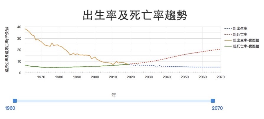 根據國家發展委員會的人口推估圖表,更可以看出2020年的粗出生率及粗死亡率於2020年交叉,粗死亡率將大於粗出生率,人口將由自然增加轉為自然減少。