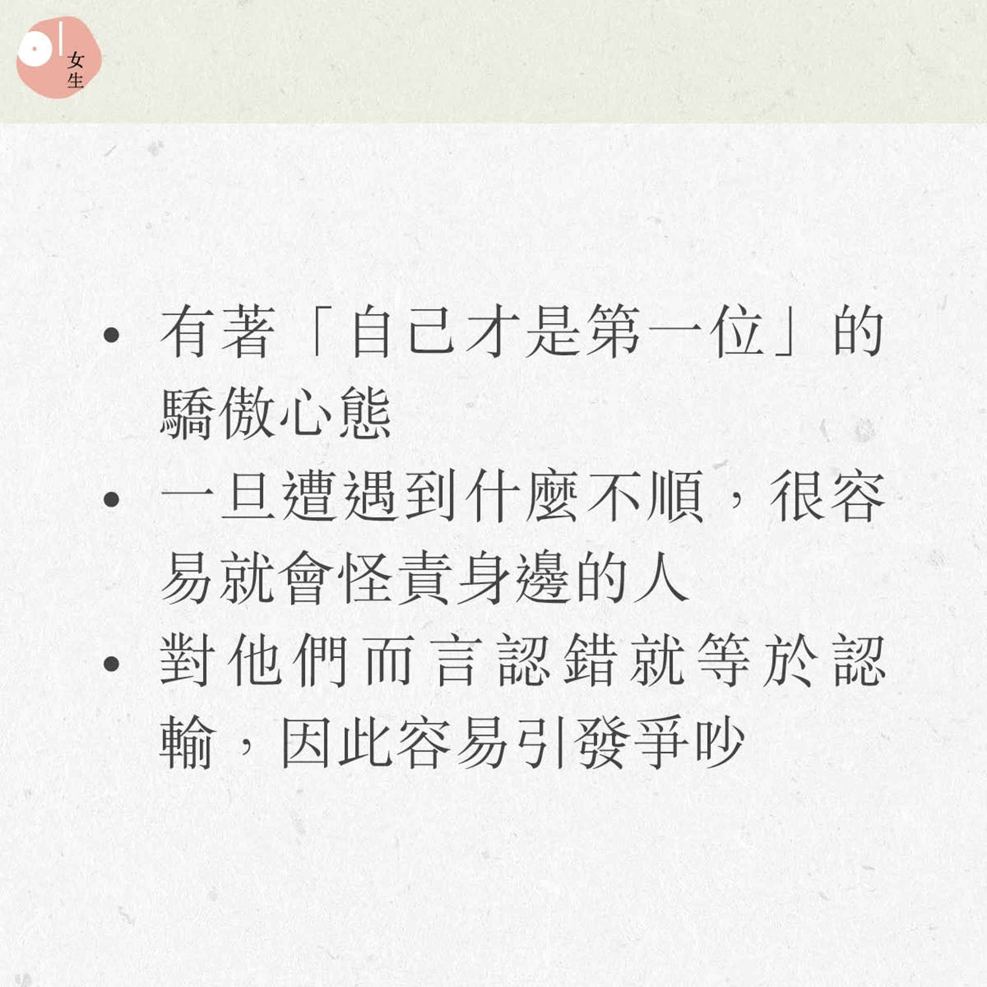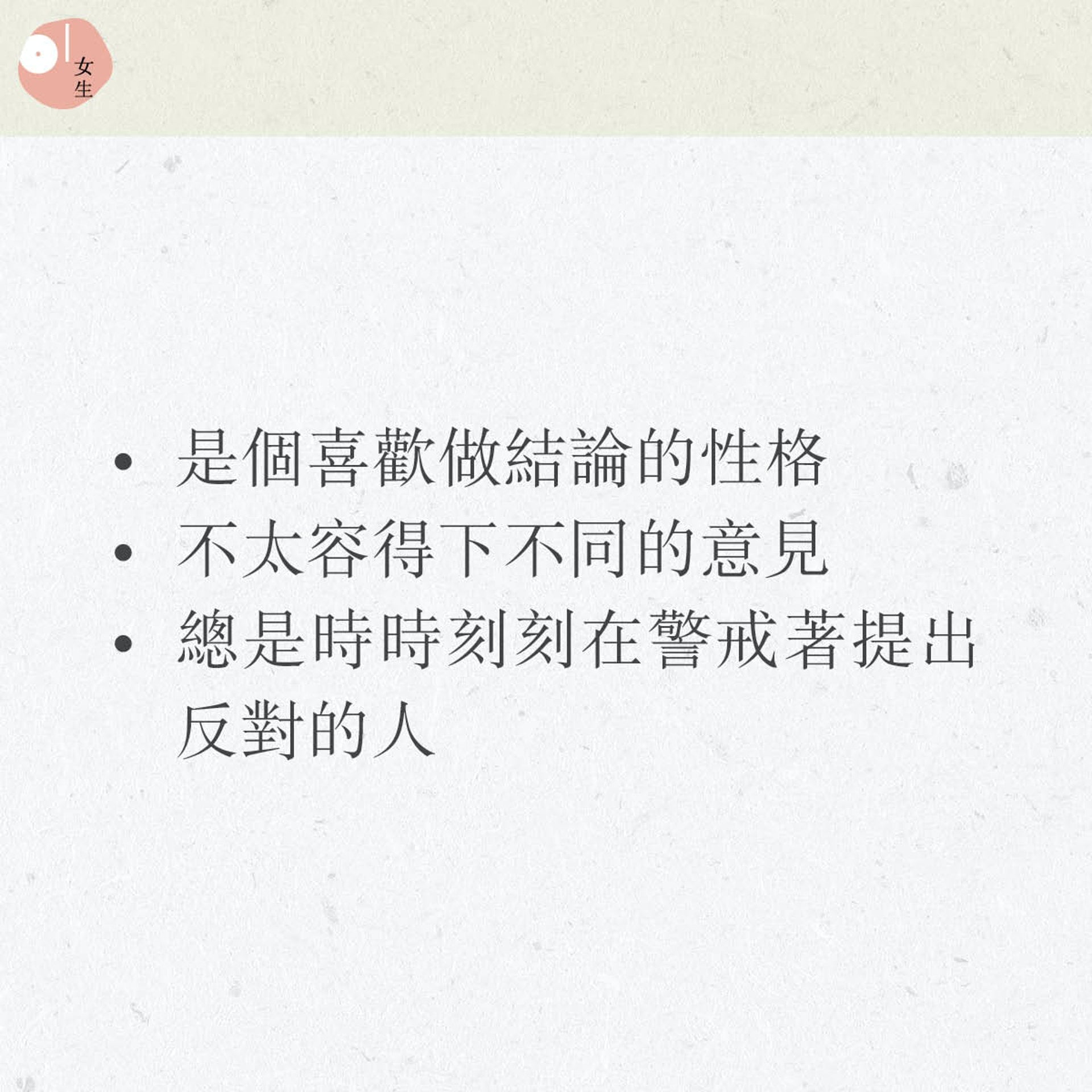 這個組合的女生很有自己的主見,是喜歡做結論的性格,不太容得下不同的意見,總是會時時刻刻在警戒著提出反對的人。雖然生氣時未必會直接反映,但從她們的微表情、態度也可略知一二。