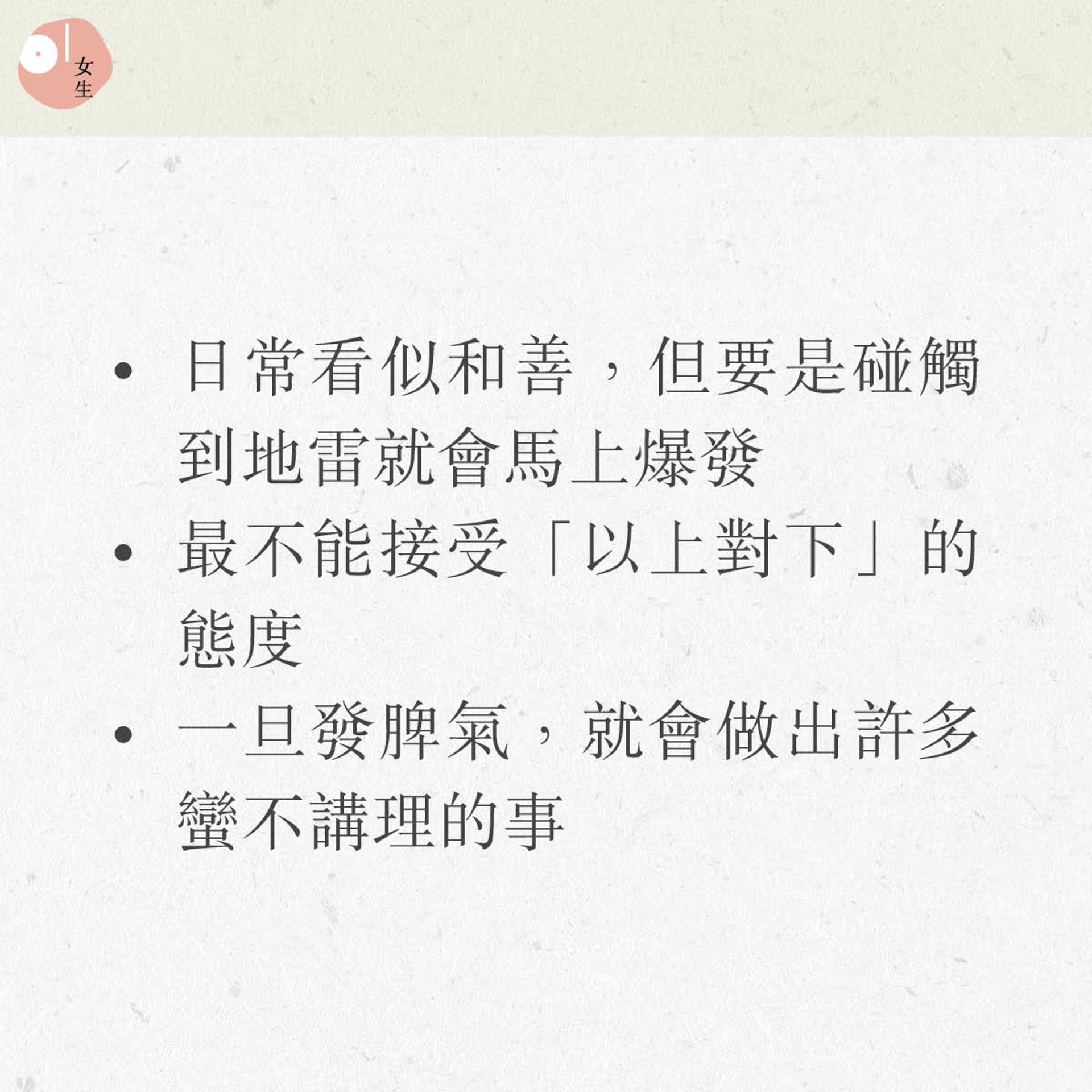 只是受了一點小刺激,就忍不住大動肝火?原來星座與血型,除了取決於性格以外,也可以揭示你的易怒程度。有沒有發現,有些人脾氣暴燥,動輒就會發脾氣,容易引發爭吵;有些人性格與世無爭,不愛計較,也不會被周遭一切所牽動影響。近日就有日本網站以星座與血型,分析出易怒組合排行榜,發現原來這個組合看似細心,但熟絡後反而會變得任性易發脾氣?