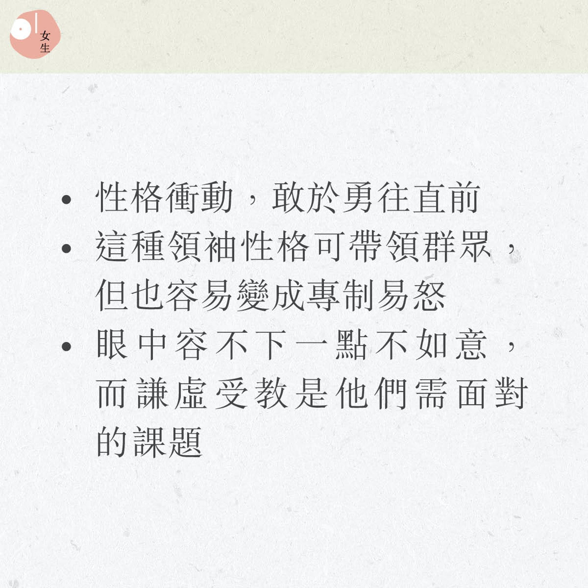 她們性格衝動,敢於勇往直前,很多時候會願意為了一個目標,不斷挑戰著自己和他人的底線。這種領袖氣質可以可帶領群眾,但也容易變成專制易怒。而正正因為眼中容不下一點不如意,因此謙虛受教會是她們需要面對和學習的課題。