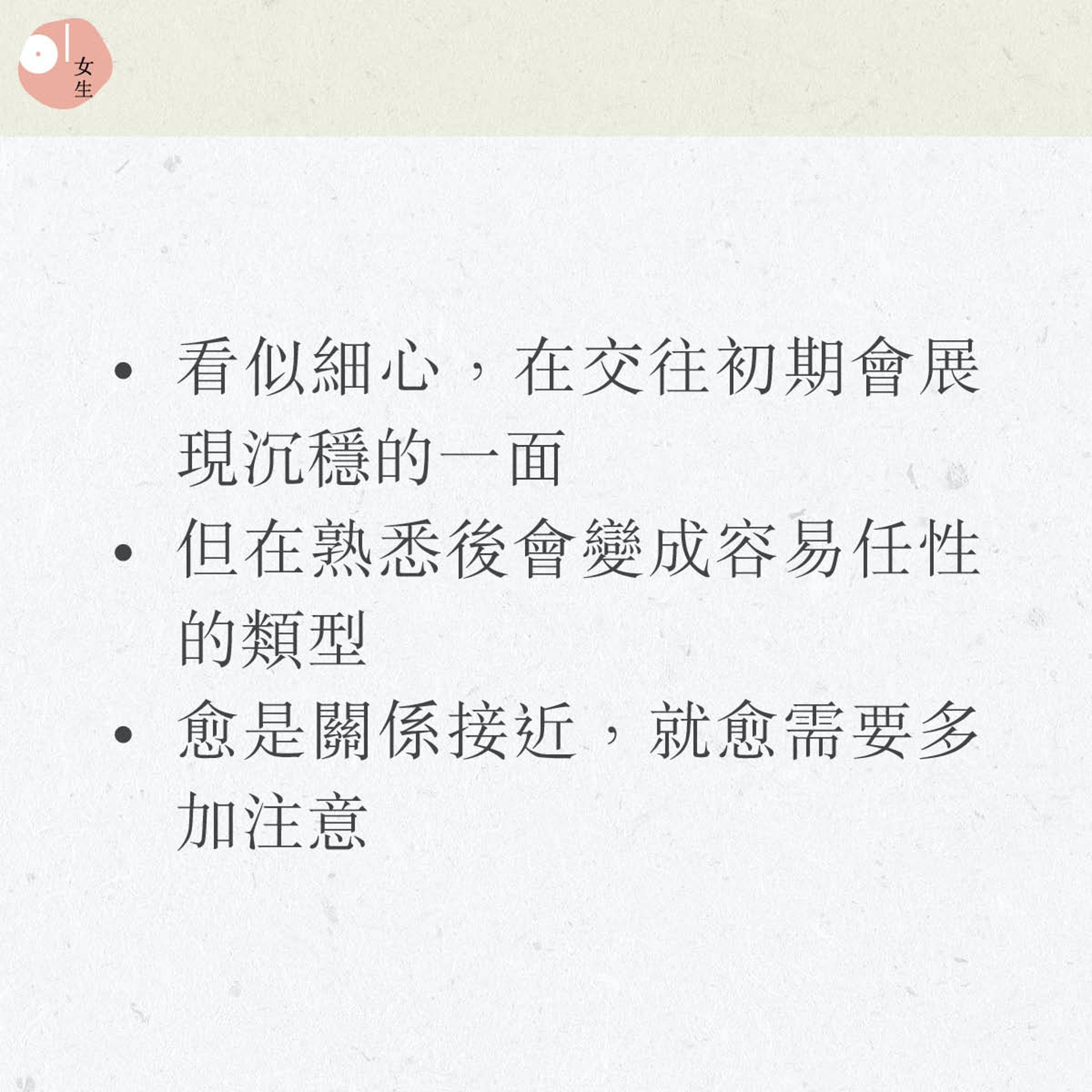 這個星座與血型組合的人從外表上看似細心溫馴,在交往初期或許會展現出沉穩的一面,然而在熟絡了解後,反而會變成容易任性的類型,日常鬧鬧脾氣就少不免。是個愈是關係接近,就愈需要多加注意的組合。