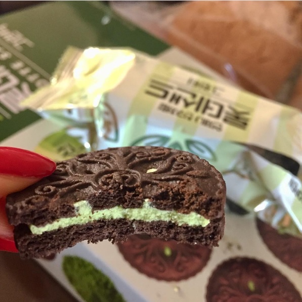 之前韓國也有出過抹茶口味的巧克力派,但之前那款是蛋糕體為抹茶口味,這款是抹茶內餡的巧克力派「冰淇淋」,重、點、是,抹茶冰淇淋內餡比外皮還厚啊!(滿足)