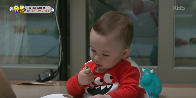 威廉寶寶吃了一大口的綠椰菜,然後爸爸在一旁說:「你現在正在吃一顆小樹噢!」威廉整個笑得好開心,看起來也吃得津津有味……