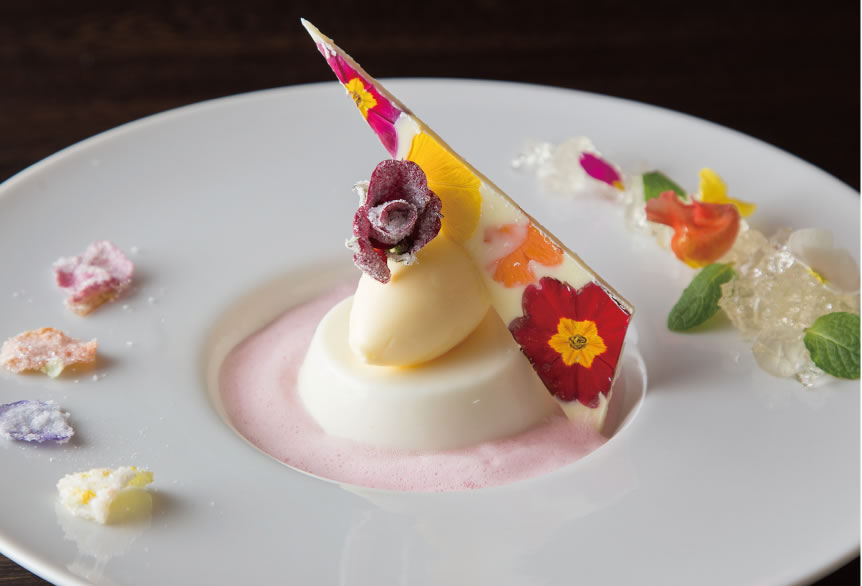 以加入乾燥花的白巧克力裝飾,奶酪搭配香草冰淇淋,佐以卡姆果風味的粉紅醬汁,就像身在花團中。
